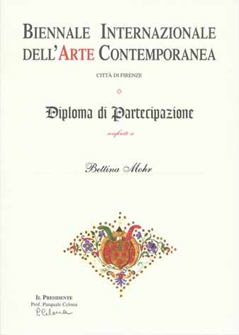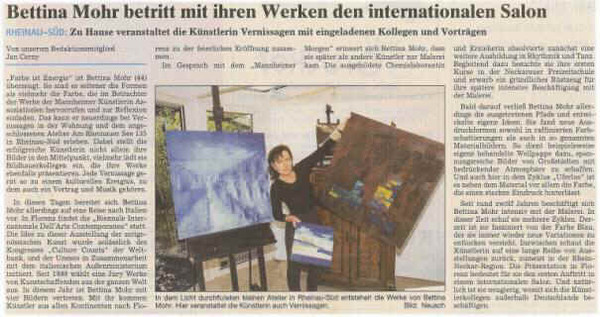Ereignis, zu dem auch ein Vortrag und Musik gehören. In diesen Tagen bereitet sich Bettina Mohr allerdings auf eine Reise nach Italien vor. In Florenz findet die "Biennale Internazionale Dell'Arte Contemporanea" statt. Die Idee zu dieser Ausstellung der zeitgenössischen Kunst wurde anlässlich des Kongresses "Culture Counts" der Weltbank, und der Unesco in Zusammenarbeit mit dem italienischen Außenministerium initiiert. Seit 1999 wählt eine Jury Werke von Kunstschaffenden aus der ganzen Welt aus. In diesem Jahr ist Bettina Mohr mit vier Bildern vertreten. Mit ihr kommen Künstler aus allen Kontinenten nach Florenz zu der feierlichen Eröffnung zusammen. Im Gespräch mit dem "Mannheimer Morgen" erinnert sich Bettina Mohr, dass sie später als andere Künstler zur Malerei kam. Die ausgebildete Chemielaborantin und Erzieherin absolvierte zunächst eine weitere Ausbildung in Rhythmik und Tanz. |
