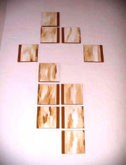 Die Installation besteht aus quadratischen Holzkörpern. Nach der Vorbehandlung des Holzes erfolgt die malerische Arbeit. Am unteren Rand des Objekts und auf den 3 cm tiefen Seiten wird die jeweilige