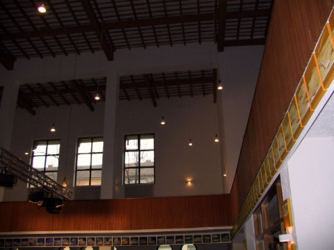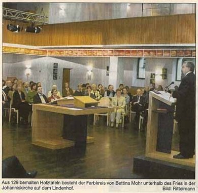 Unter der Empore zieht ein Farbband, bestehend aus 129 Holzkörpern (30x30x3cm), die Aufmerksamkeit des Betrachters auf sich – eine Ornamentik, die zu einem Teil der Architektur wird. Die
