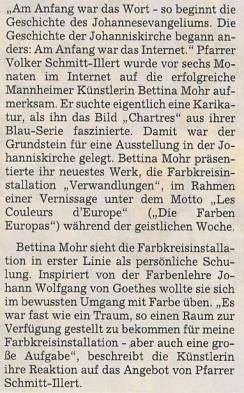 Mit der Installation "Verwandlungen" begebe ich mich auf diesen Pfad. Es ist der Versuch, Farbe, Form und Fläche in ihrem Zusammenklang zum Gegenstand der Arbeit zu machen. Das Merkmal dieses Werkes