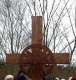 Die Christussonne, der Kranz, wird in einem Durchmesser von 1,20 m aus Cortenblech gearbeitet. Dieses Material läuft nach kurzer Zeit an und vermittelt so, passend zu dem Holzkreuz, eine haptische Einheit. Das Zeichen der Zeit wird im Material sichtbar.