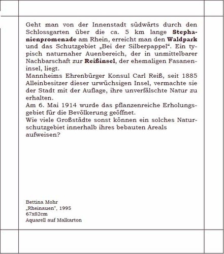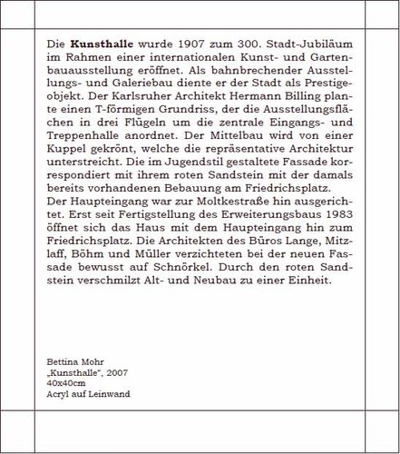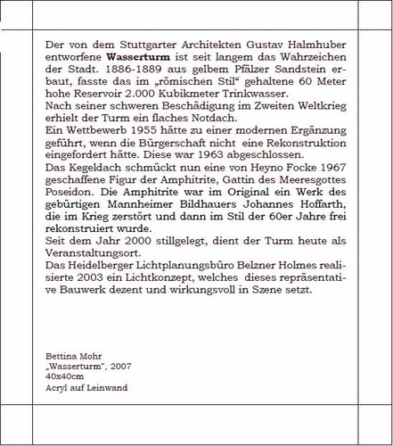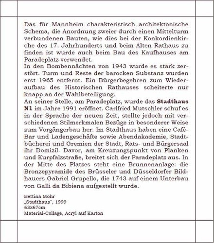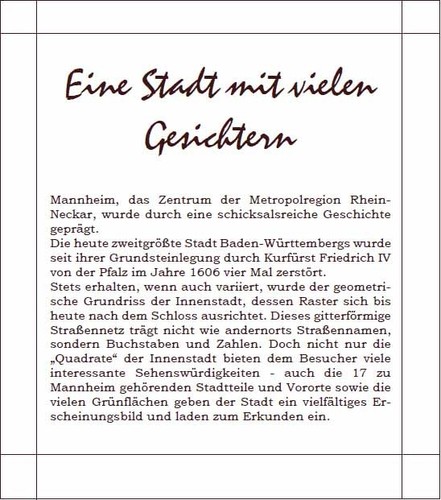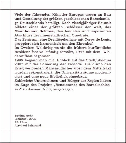Diese Hülle ist Träger von insgesamt 14 festen Karten auf deren seidenmatt glänzender Vorderseite Gemälde imposanter und bekannter Mannheimer Gebäude zu sehen sind.