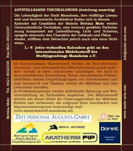 Aus dem Verkauf des Kunstkalenders „Mannheim 2008“ kommt dem Internationalen Mädchentreff des Stadtjugendring Mannheim e.V. 1 € pro Exemplar zu.